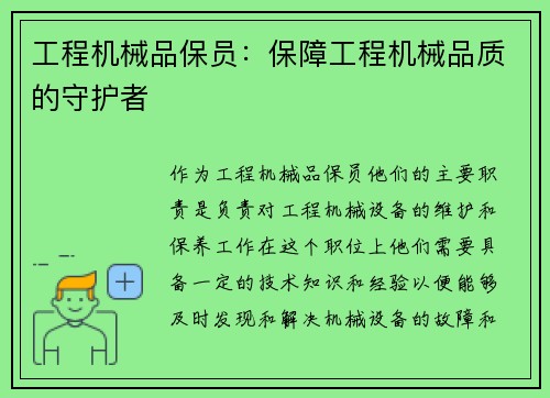 作为工程机械品保员,他们的主要职责是负责对工程机械设备的维护和保养工作。在这个职位上,他们需要具备一定的技术知识和经验,以便能够及时发现和解决机械设备的故障和问题。下面将详细阐述工程机械品保员的工作职责。